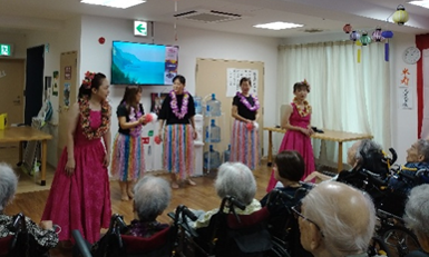各フロア、ご入居者様のお祝いのため、試行錯誤し特設茶話会やフラダンス、職員のダンスなど思い思いの催しを実施いたしました。扮装した職員をジーっと見つめ「誰やろか、あの人やろか」と悩まれる方、フラダンスを一緒にされる方、お祝いに涙される方、様々でした。
